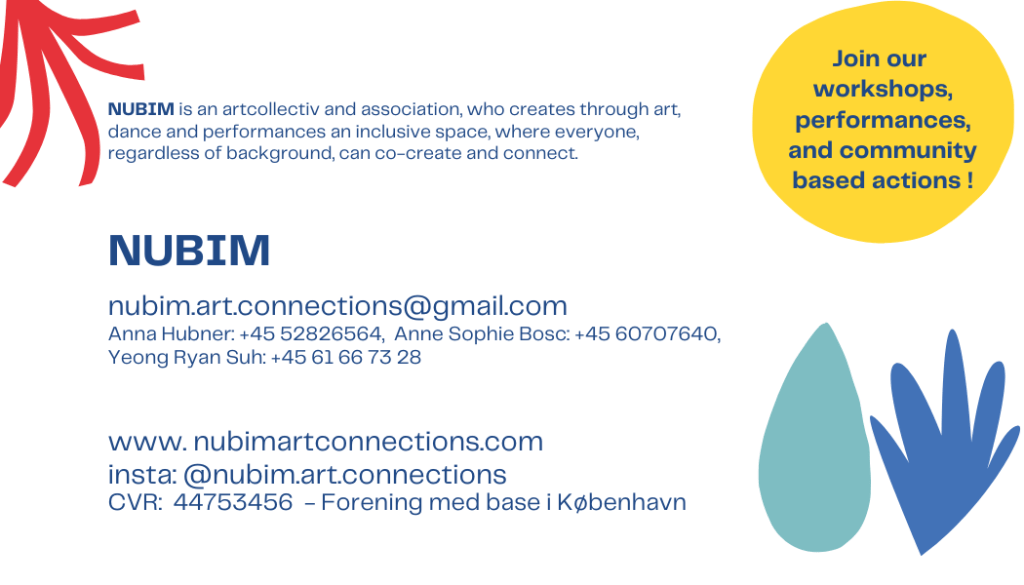 NUBIM is an association where visual artists, dancers and cultural mediators work together to create a community and inclusive, co-creative art projects with children, young people and families – regardless of background, gender and ethnicity. They work in the fields of visual arts, dance/body and nature/sustainability.